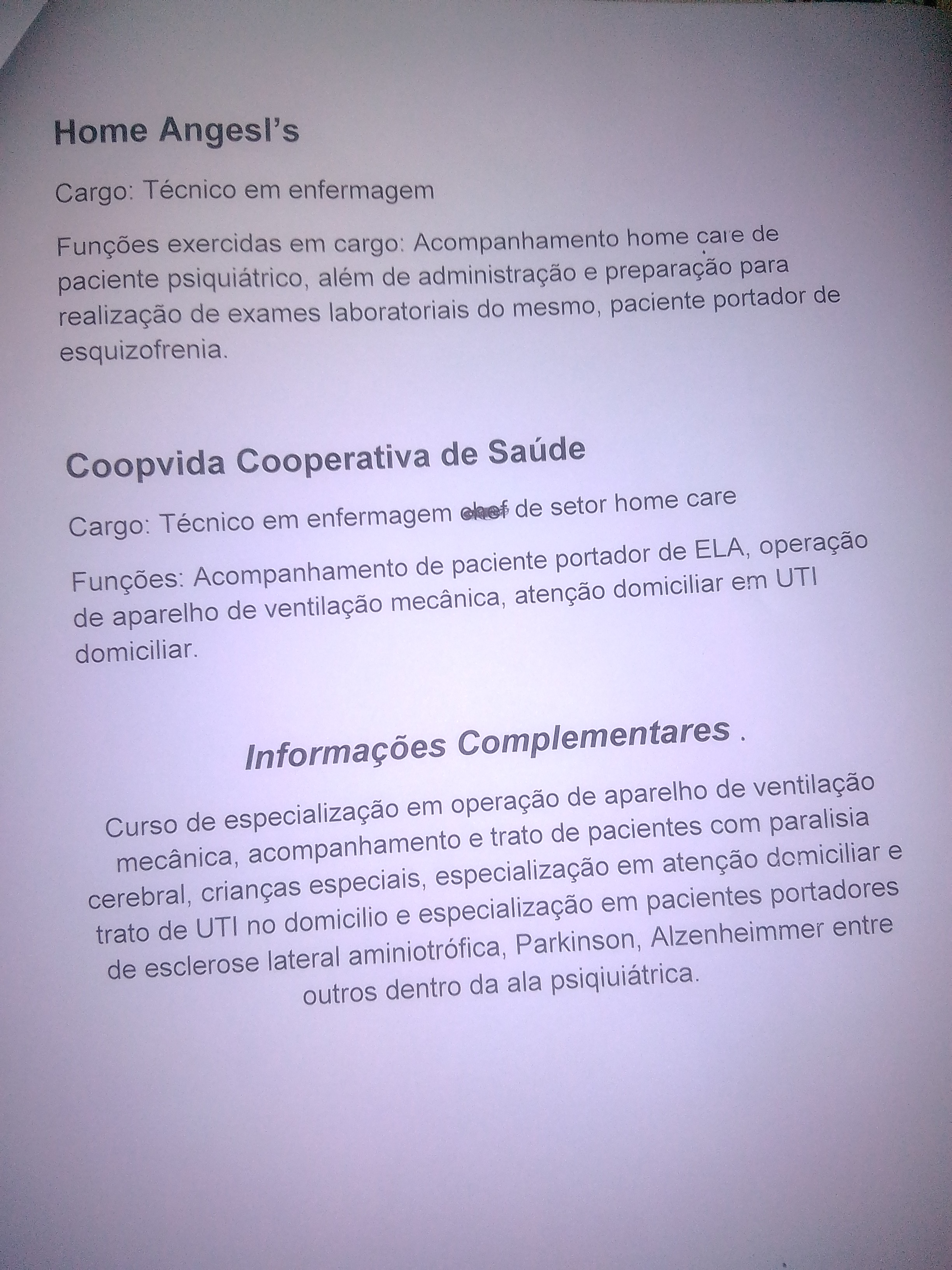 Experiência com pacientes psiquiátricos, terminais alem de operação de equipamento bipap cipap e trilogi entre outras.
